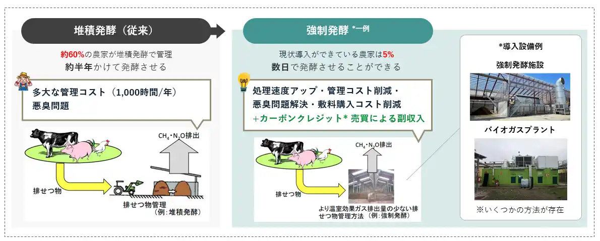 鶏・豚・牛の家畜の排せつ物に強制発酵設備を導入することにより発酵速度を上昇させ、発酵過程で発生するメタン(CH₄)や一酸化二窒素(N2O)を削減し、その削減分をJ-クレジットとして認証する仕組みです。 |