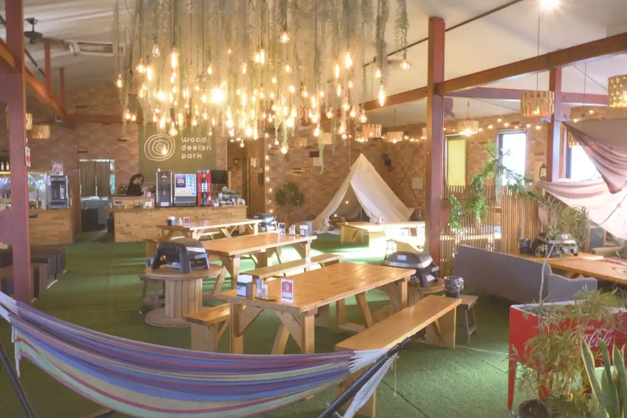 名古屋市緑区の野並店は、木の温もりに包まれた広大なグランピング空間です。人工芝と大型テントが広がる店内は、街中にいながら本格的なキャンプ気分が味わえます。 |