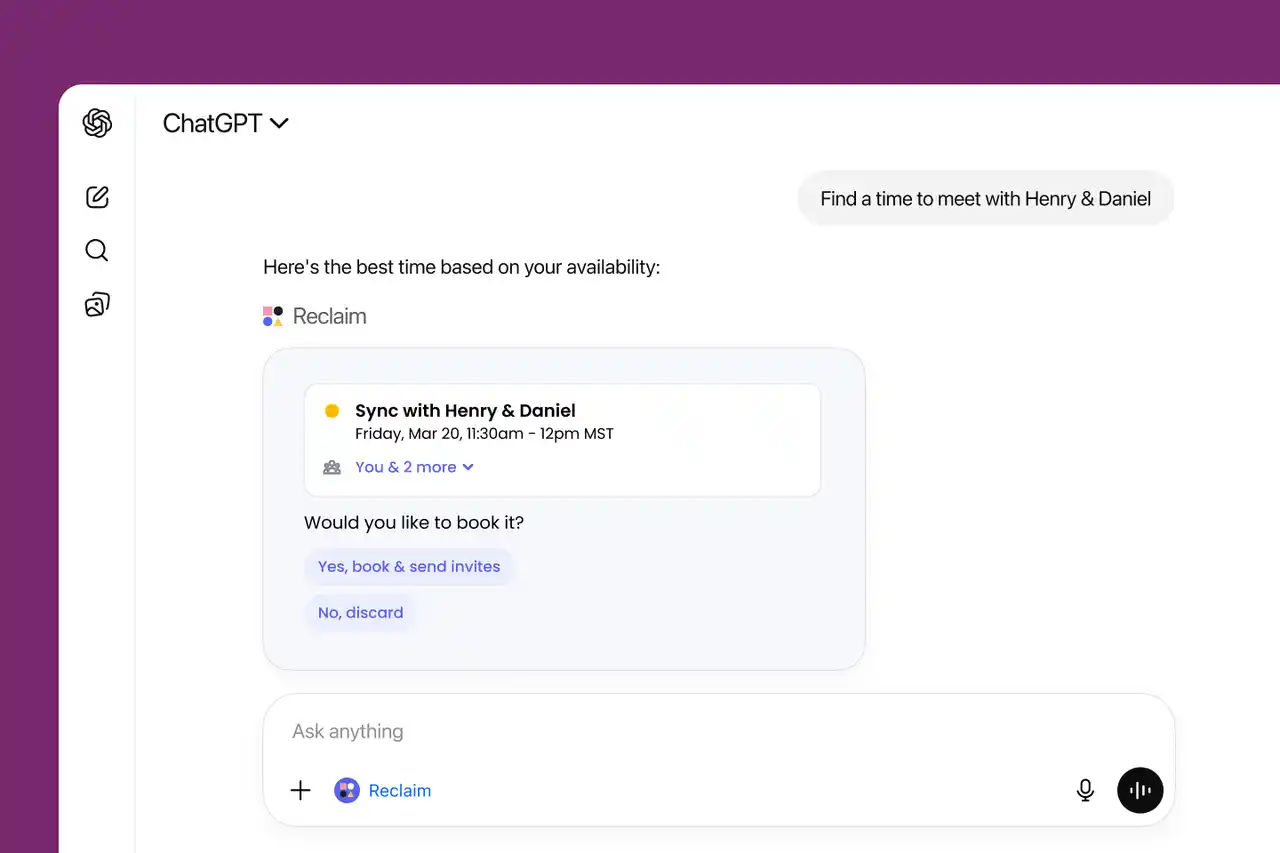 | ChatGPT用Reclaim AIアプリは、世界中で英語版の提供を開始しています。本機能は、Reclaim AIのカレンダーシステムの最新バージョンを利用しているユーザーが対象となります。 | |||