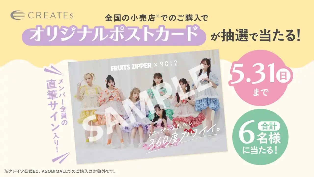 | 2026年5月31日(日)までのキャンペーン期間中、全国の小売店で「FRUITS ZIPPER×9012 コラボ限定セット」をお買い上げのお客さまの中から抽選で6名様に、FRUITS ZIPPERメンバー全員の直筆サイン入り「FRUITS ZIPPERオリジナルポストカード」をプレゼントいたします。詳細ページより、応募方法・注意事項をご確認の上ご応募ください。 | |||||||||||||||||||||
