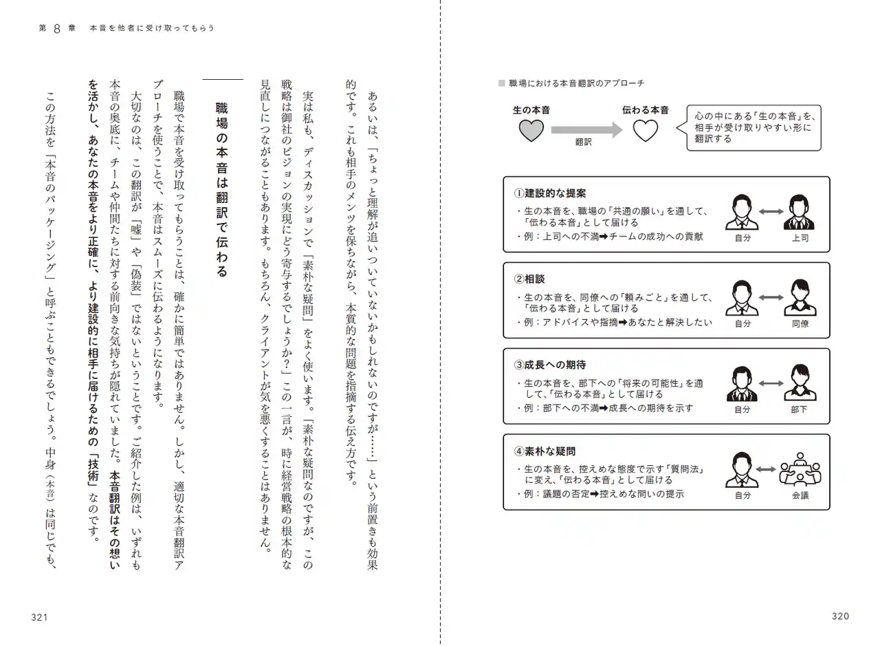 | また最終章の第8章では、「職場」「家族・パートナー」「友人・仲間」といったシーン別に、本音を伝えるために他者とどう対話するかを具体例で示しています。 | ||||||||||||||||