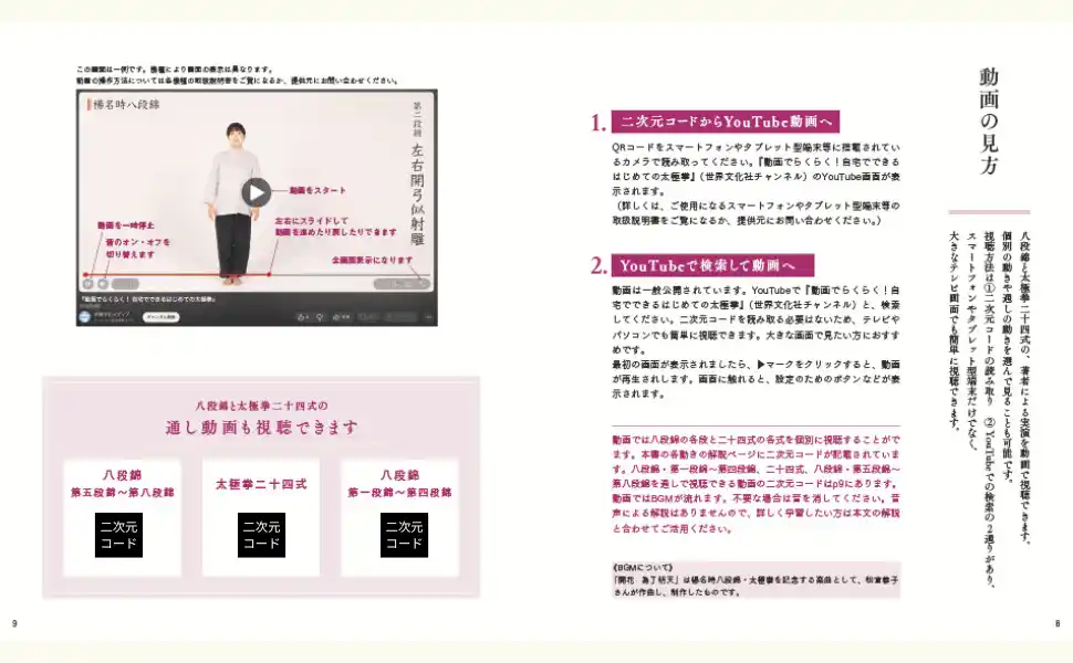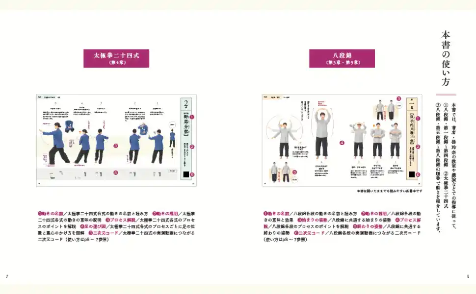 全動作をプロセス写真+動画で解説。つまずきやすい動きも視覚的に理解でき、初心者でもスムーズに習得できます。楊玲奈先生の実演動画は、二次元コードからも、タイトル検索からも気軽に視聴が可能です。大きなテレビ画面で見たい方にもおすすめ。 |