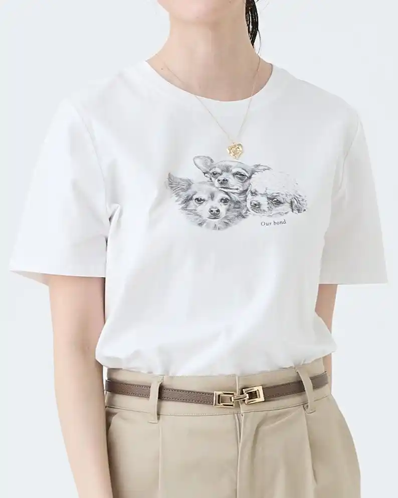 日差しが心地よくなるこれからの季節。N+では、1枚でも、羽織りのインナーとしても主役になるフォトプリントTシャツをご用意しました。3匹の愛らしい犬や猫のプリントが目を引くデザインながら、モノクロ配色に仕上げることで、甘くなりすぎず、デイリーにコーディネートしやすいカジュアル感を演出しています。肌触りやわらかな綿混素材を採用し、快適な着心地と、デニムや麻のパンツといった季節の定番ボトムスとも相性抜群のシルエットが特長です。 |