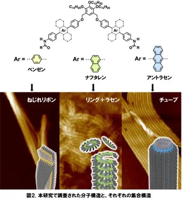 | ベンゼン、ナフタレン、アントラセンの3種類のπ電子系部位を持つ折りたたみ可能な複数の分子を合成したところ、それぞれの折りたたみ方はπ電子系部位の拡張に伴って変化し、それに対応して自己組織化構造も大きく変化しました(図2)。 | |||