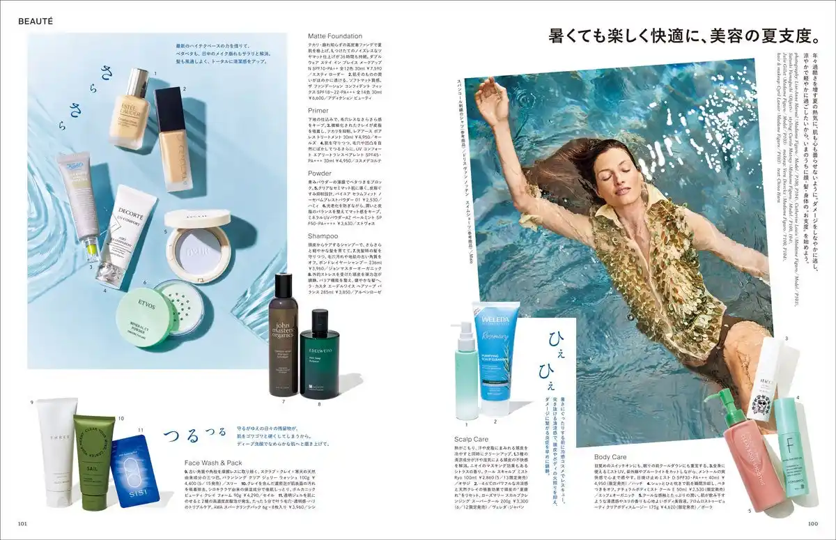| 年々過酷さを増す夏の熱気に、肌も心も曇らせないように。ダメージをしなやかに逃し、涼やかで軽やかに過ごしたいから、いまのうちに顔・髪・身体の“お支度”を始めよう。 | |||