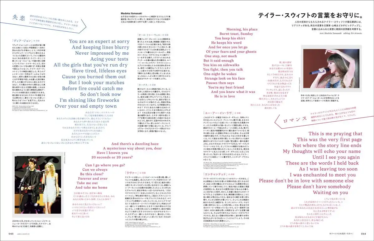 | 人生の苦楽からもたらされるテイラー・スウィフトが綴る歌詞には、リアリティがある。珠玉の言葉を文筆家・山崎まどかがピックアップし、言葉に込められた背景と歌詞の世界観を考察する。 | |||