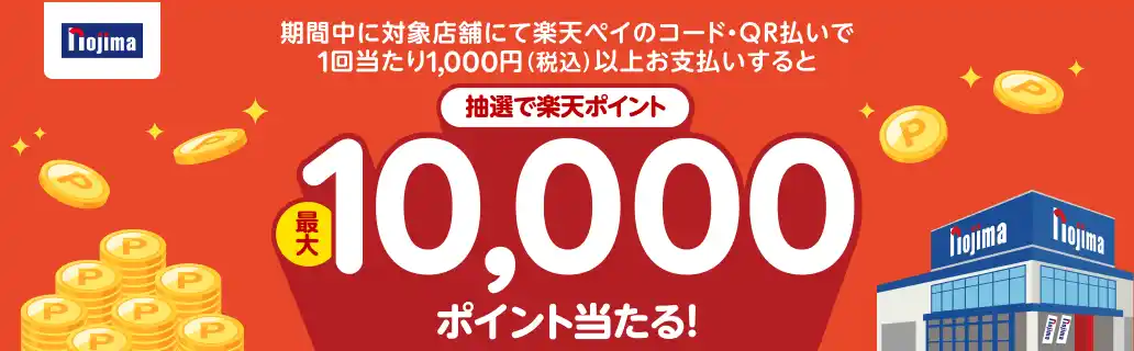 1.本キャンペーンにエントリー 2.キャンペーン期間中に「ノジマ」の対象店舗にて、「楽天ペイ」で1回の買い物で1,000円(税込)以上の支払い ※1と2の順序は問いません。 |