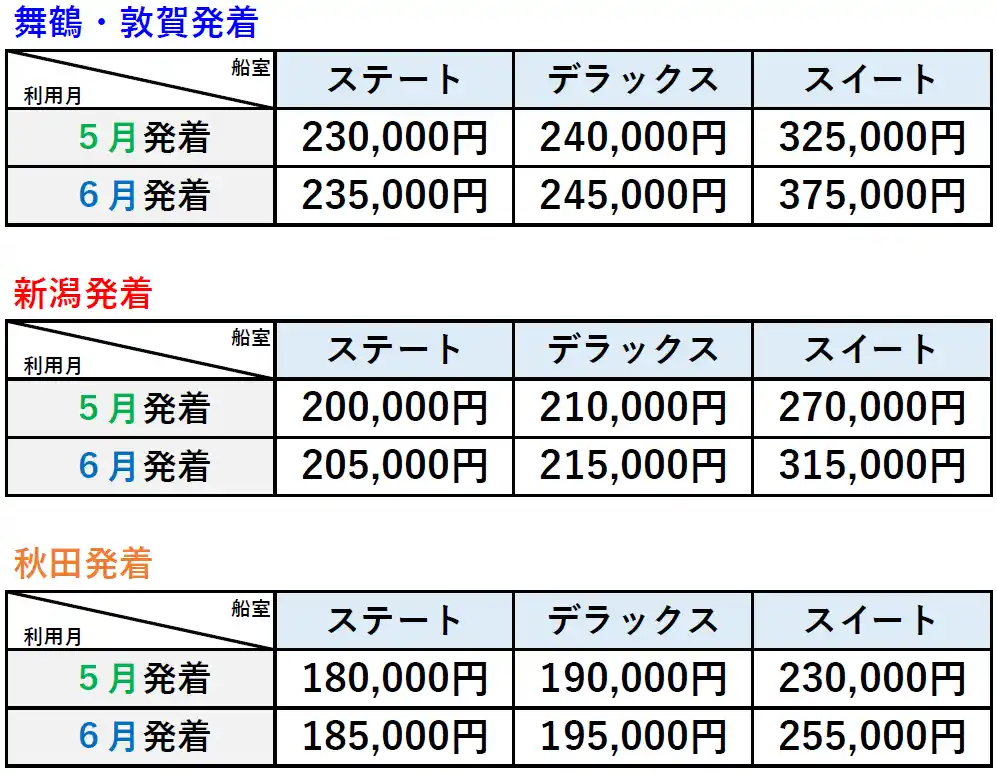 | 設定日/2026年5月7日出発~6月30日帰着まで(新潟・秋田航路は6月28日帰着まで) | |||||||||