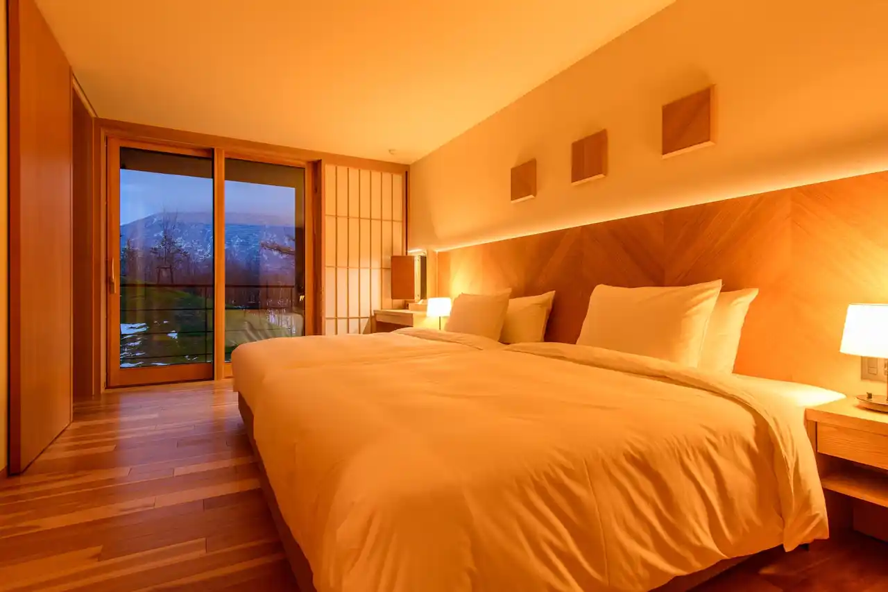| 客室は、広いリビングルームとツインベッドルーム、源泉かけ流しの湯から望む、壮観な羊蹄山の雄姿をご堪能。非日常と寛ぎを心行くまでお楽しみください。 | |||||||||