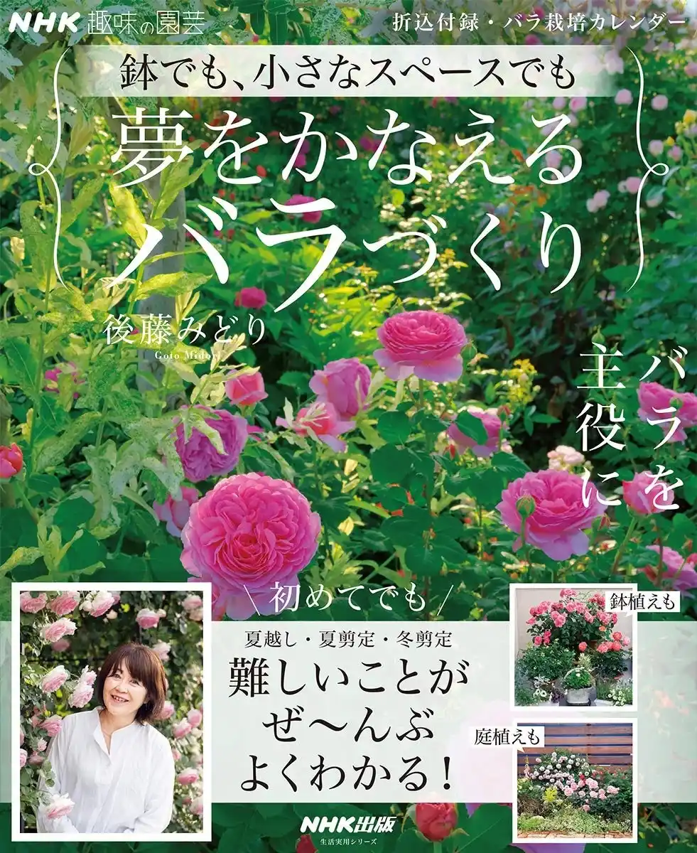 「バラを育ててみたいけど、自信がない」「もっと楽しみたいけれど、広い庭もないし…」--そんな思いを持つ方へ。意外にもバラはたくましい植物で、コツさえ覚えてしまえば初心者でも育てるのは難しくなく、小さなスペースでも美しい花を咲かせることができます。2026年4月20日発売の『NHK趣味の園芸 鉢でも、小さなスペースでも 夢をかなえるバラづくり』ではバラのスペシャリスト・後藤みどりさんが、「鉢植え」「庭植え」別に、バラ栽培のコツや、バラと相性のよい草花などを紹介。1年を通して変化するバラの姿を定点観察で解説しながら、比較観察写真でお手入れの意味や大切さがすっきり理解できます。折込付録「バラ栽培カレンダー」付き。