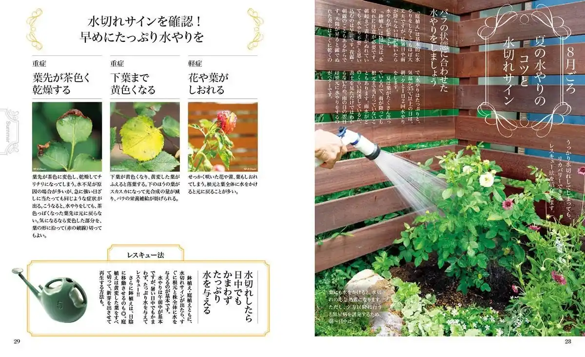 | 近年の厳しい暑さから大切なバラを守るための夏越し対策はもちろん、夏に起こりやすい異変やトラブルへの対処法についても紹介しています。 | |||||||||||||||||