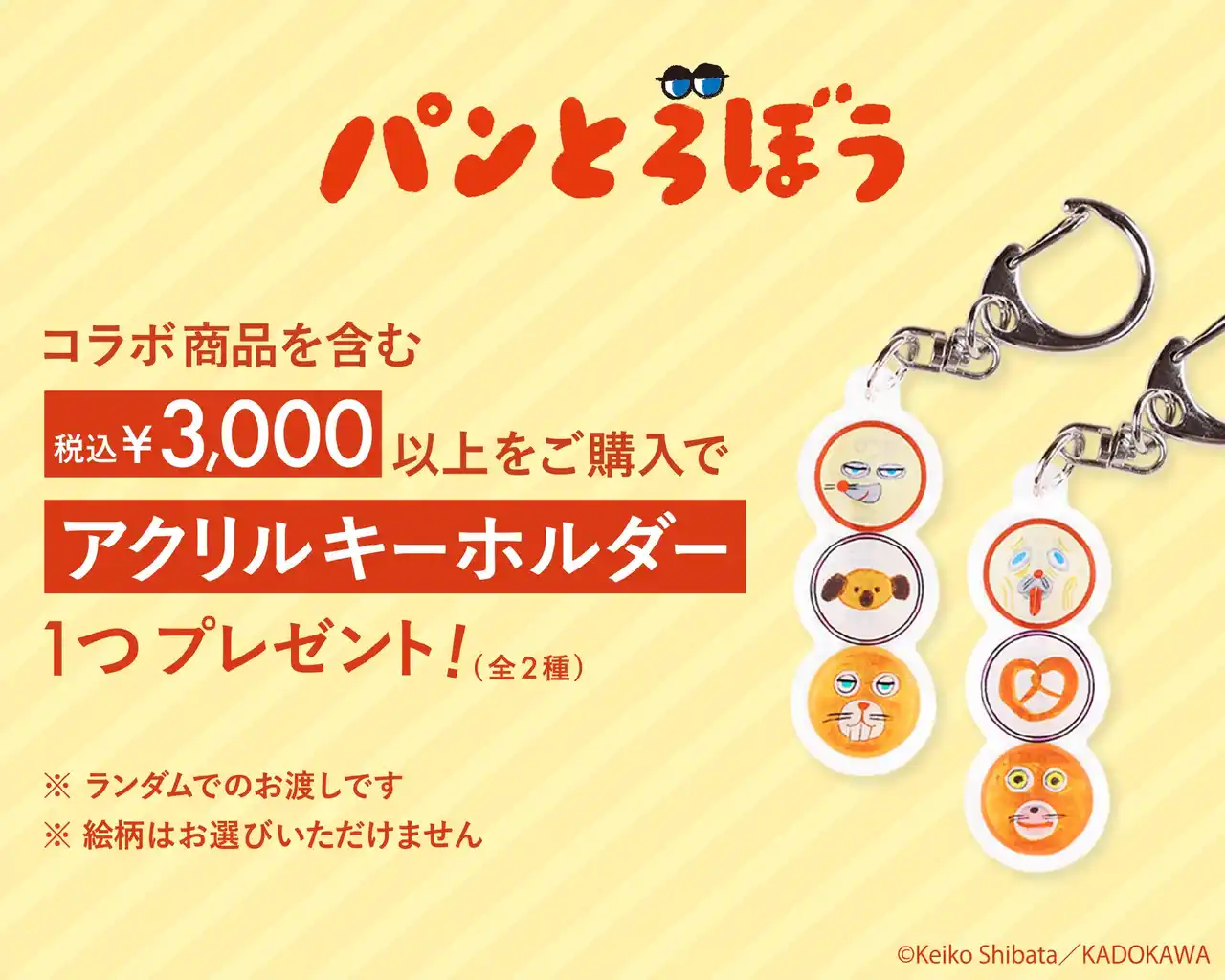 全国の店舗で「パンどろぼう」商品1点以上を含む、税込3,000円毎のご購入で、「オリジナルアクリルキーホルダー」をおひとつプレゼント! |