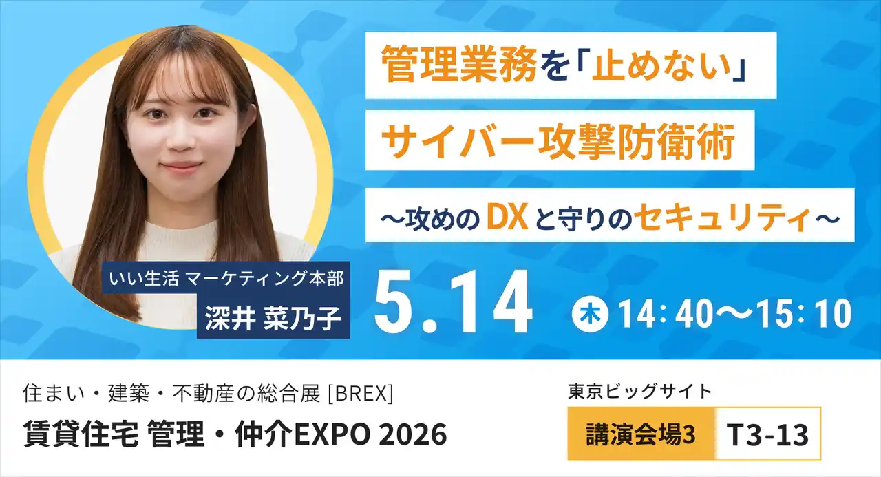 不動産業務を網羅するバーティカルSaaSと業務効率を推進するBPaaS(※1)で不動産市場のDXを推進する株式会社いい生活(東京都港区、代表取締役社長 CEO:前野 善一、東証スタンダード:3796、以下:いい生活)は、2026年5月13日(水)~ 15日(金)に開催される「住まい・建築・不動産の総合展 BREX」に出展します。また、14日(木)に予定されている特別講演では、いい生活 セールス&マーケティンググループ マーケティング本部 マーケティング部の深井 菜乃子が登壇します。 |
