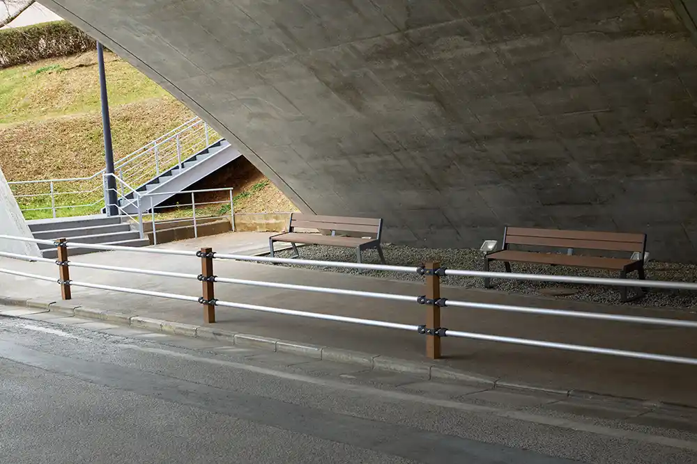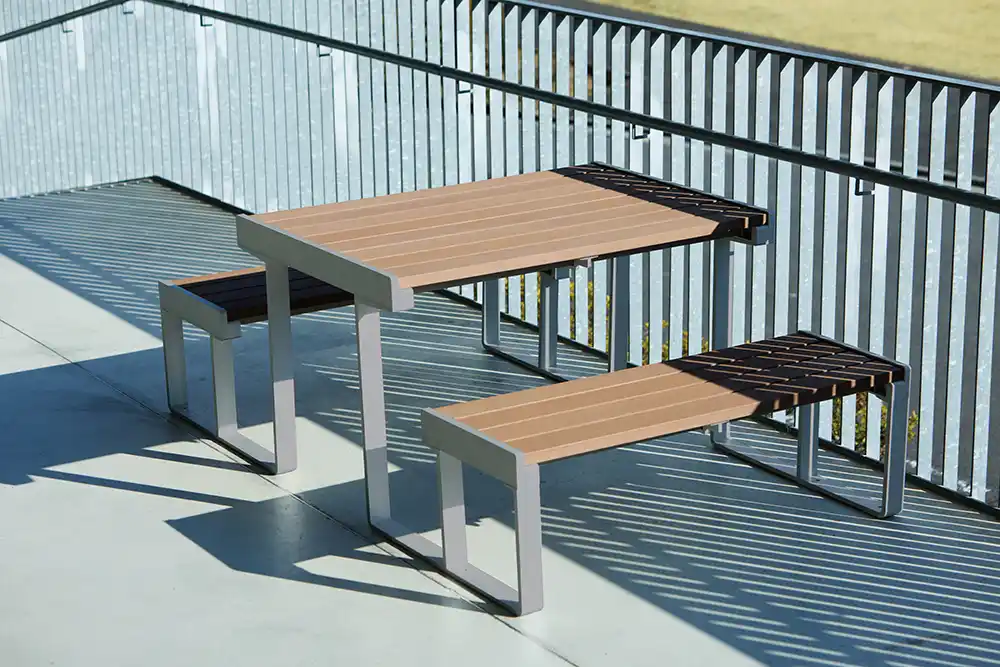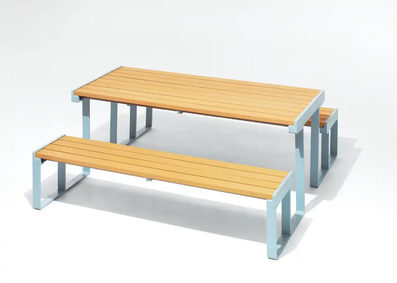 これまで、背ありベンチ、背なしベンチ、テーブル、ゴミ箱、ボラードの5プロダクトを展開してきましたが、この度、ベンチとテーブルが一体となった「ベンチテーブル」と角型ポールとパイプによる横断防止柵「ロッドフェンス」の2プロダクトを追加発売します。 |