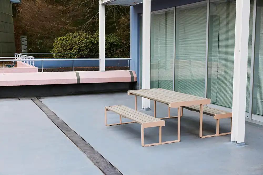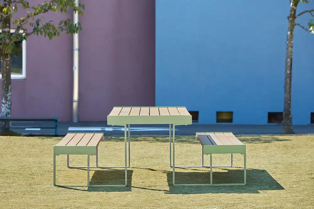 背もたれのないベンチとテーブルを一体化した製品です。最大6人掛けのベンチテーブルは存在感がありながらも構成を最小限に抑えたスマートな佇まいで、空間に自然と人を引き寄せます。ベンチとテーブルが固定されていることで位置ズレや使い方の迷いが生まれにくく、誰もが安心して利用できる公共性の高いプロダクトです。 |