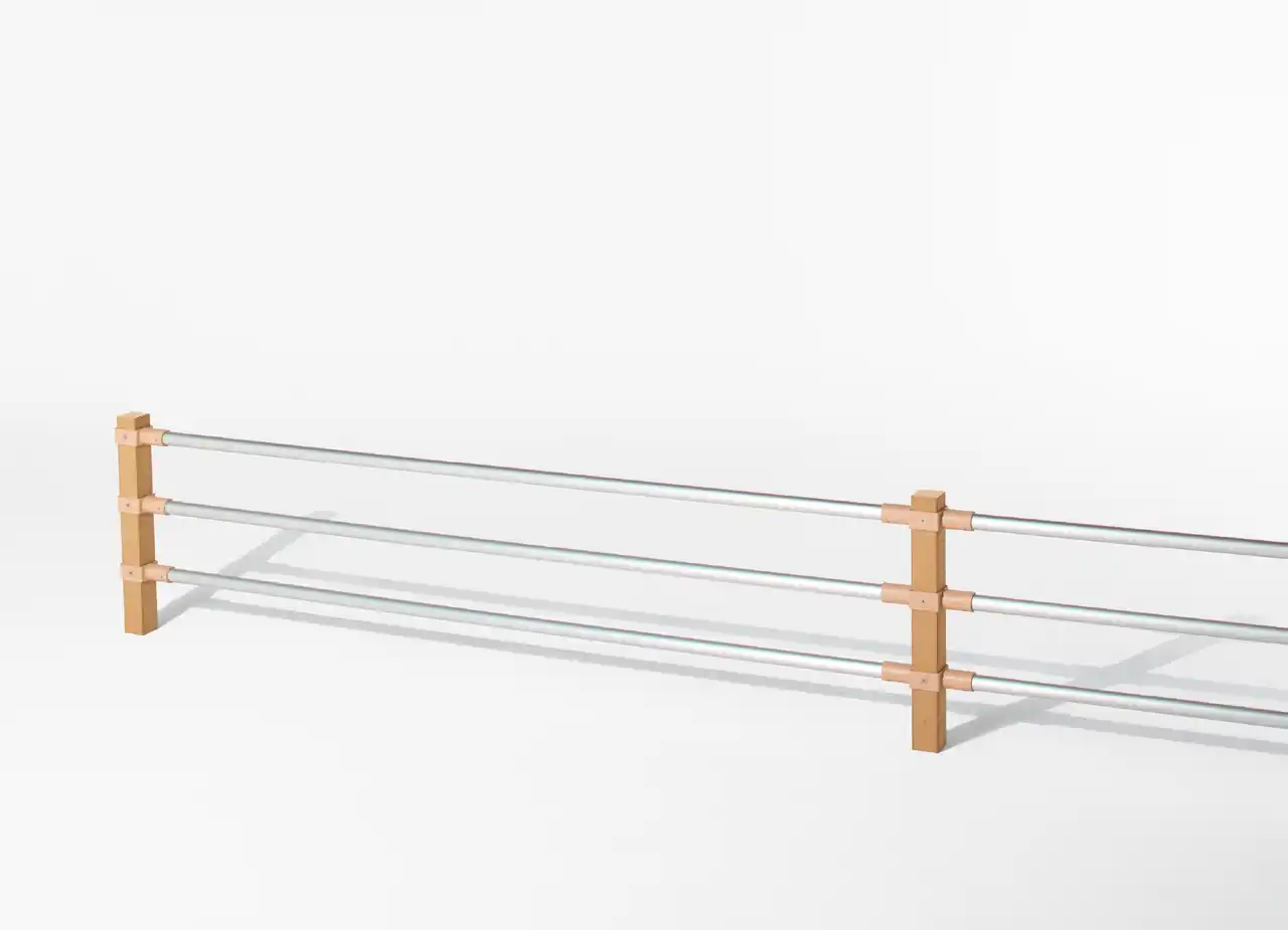 高さ800mmのボラードとアルミニウム製のジョイント材、パイプを用い視覚的に歩行者の横断を防ぐことを目的とした製品です。90通りのカラーセレクトから自由に組み合わせることができる、豊かな色彩が特徴のこれまでにない横断防止柵です。 |