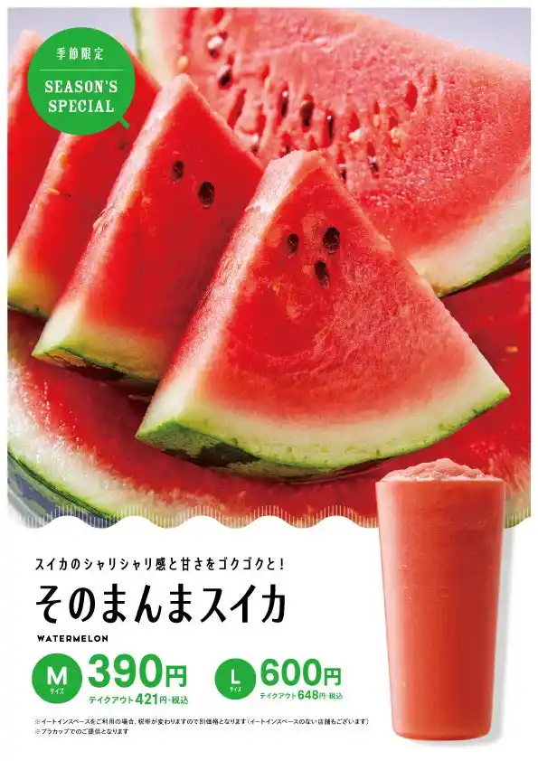 韓国を中心にフレッシュなスイカジュースの人気が高まる中、当社でも夏の定番商品として長年ご好評をいただいている『そのまんまスイカ』を販売いたします。『そのまんまスイカ』は、手作業で丁寧に種を取り除いたスイカの果肉を100g以上たっぷり使用し、ご注文ごとにその場でミキシングするフレッシュジュースです。氷と果肉を絶妙なバランスでミキシングすることで、まるでスイカを“そのまんま”食べているかのような、シャリシャリとした食感とみずみずしい味わいをお楽しみいただけます。毎年初夏から夏にかけて販売しており、昨年は総販売数123万杯を突破しました。発売以来、季節限定商品の中でもトップクラスの人気を誇る、当社を代表する夏の定番商品です。 |