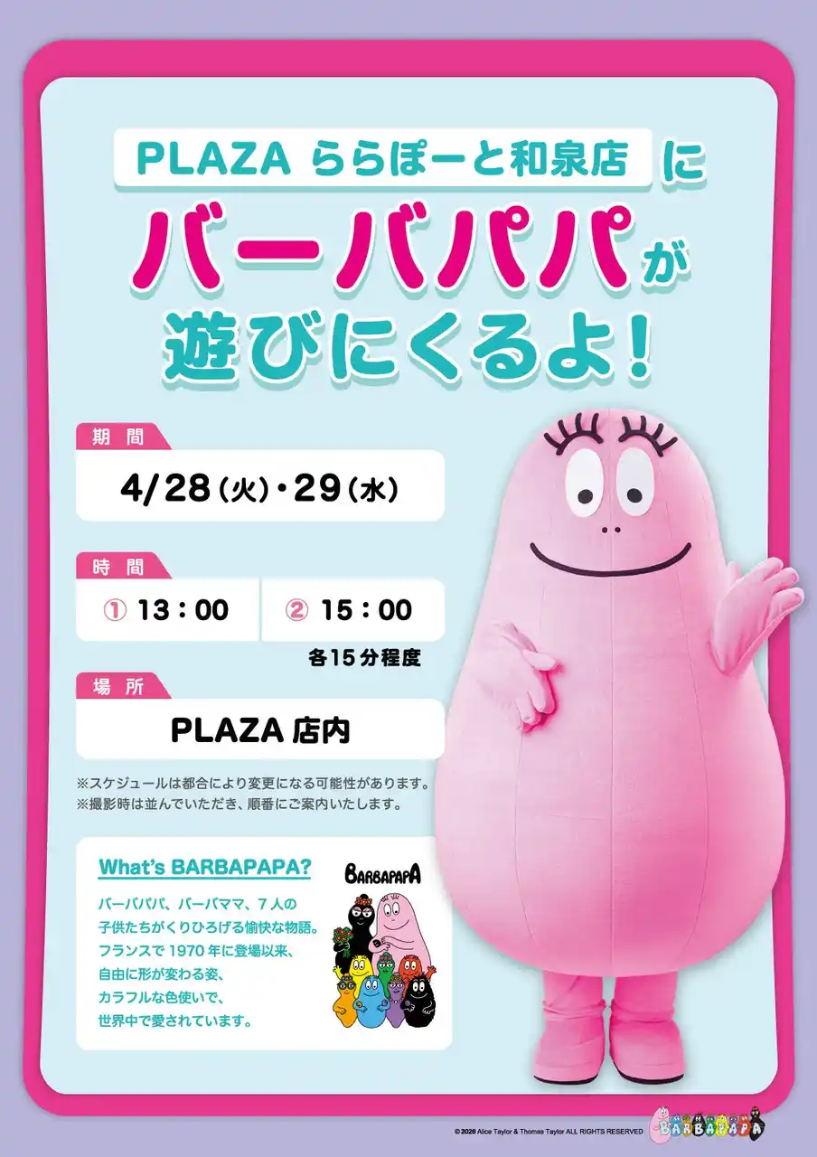 株式会社スタイリングライフ・ホールディングス プラザスタイル カンパニー(東京都新宿区、以下プラザスタイル)は、4月22日「バーバパパの日」を記念し、4月18日(土)~30日(木)をBARBAPAPA WEEKとして、プラザスタイルがマスターライセンスを保有するプロパティ「バーバパパ」のコラボレーション商品の発売やイベントを多数開催いたします。ご家族やご友人をお誘い合わせの上お越しください。 |