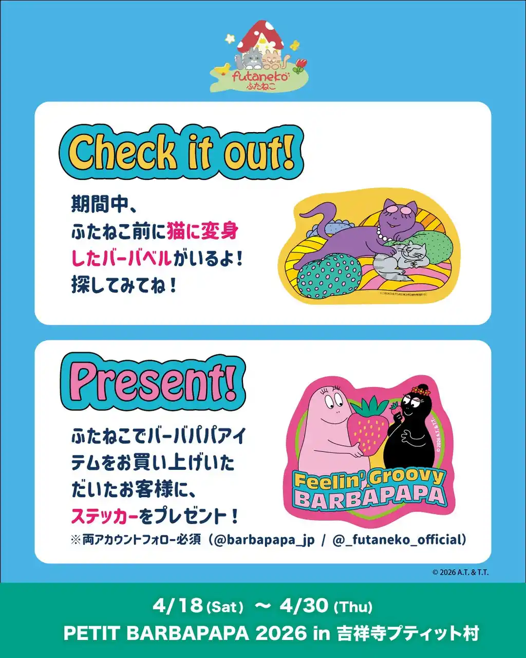 「3F雑貨店『ふたねこ』」では猫に変身した「バーバベル」が隠れているかも…?! さらにSNSフォロー&バーバパパグッズ購入でノベルティステッカープレゼント! ※パネルにはお手を触れないようお願いいたします。 |