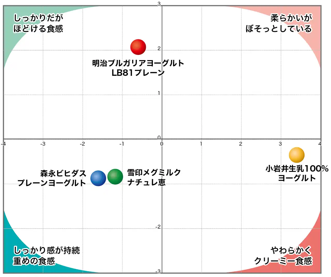 〈雪印メグミルクナチュレ恵〉酸味と酸のにおいが共に中程度で、食感も急激な崩壊を伴わずなじみながら持続する傾向であり、比較的バランス型 |