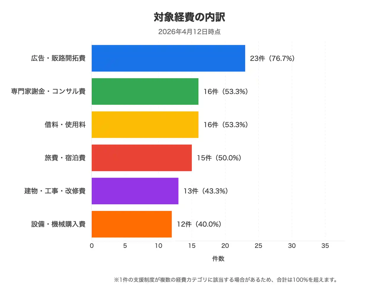 展示会出展や商品PRに直結する広告・販路開拓費が中心で、専門家謝金・旅費を合わせてカバーできる制度が半数超の構成です。