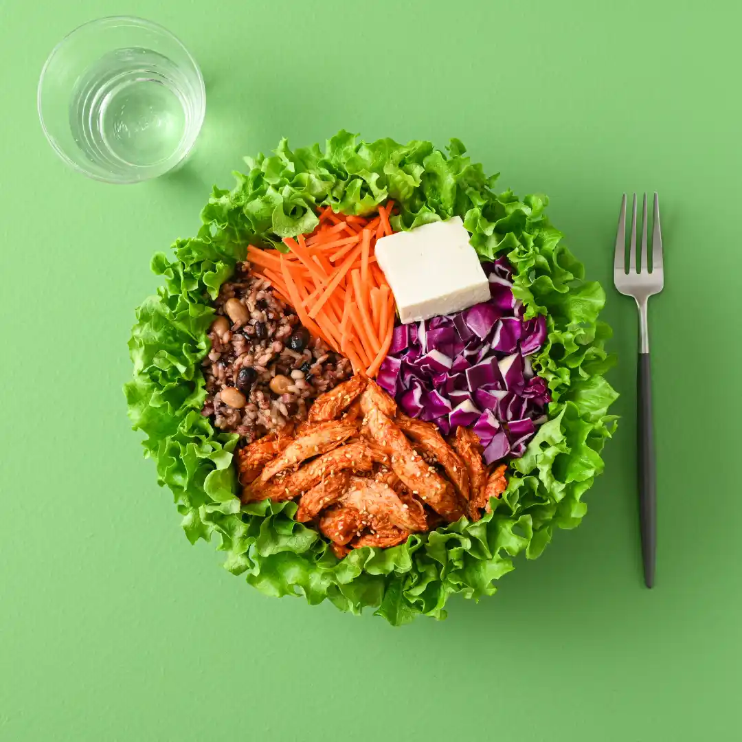 ヤンニョムチキンと十五穀米の韓国風サラダ |