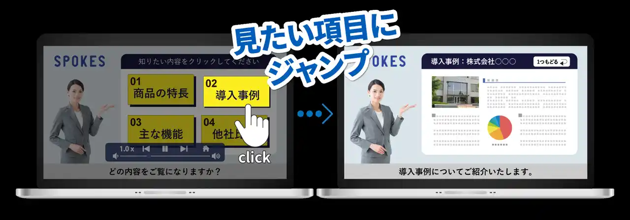 視聴者が見たいページをクリックして視聴できる「視聴者参加型のインタラクティブ動画」を作成できます。一方的に動画を見るのではなく、視聴者自らが知りたい情報を選択することが可能です。 |