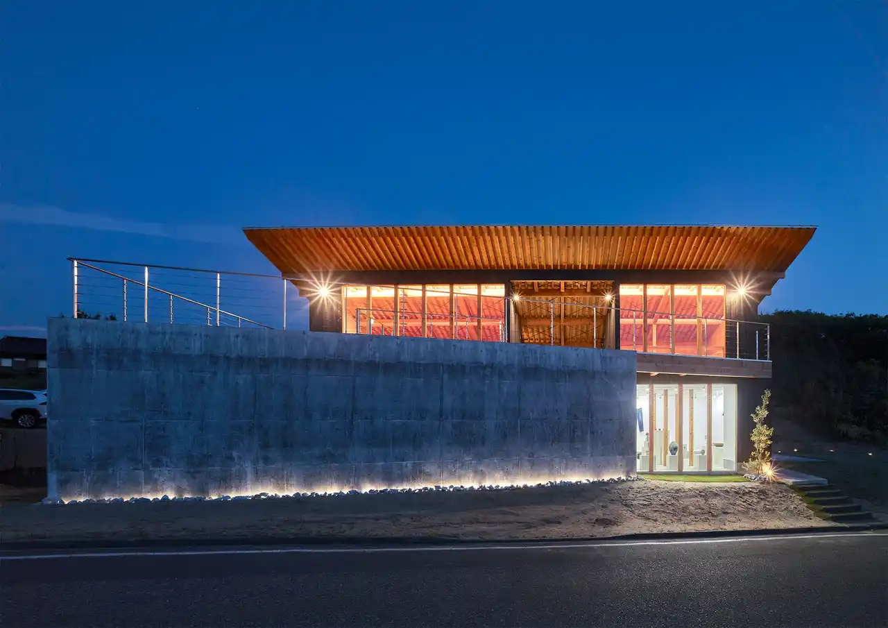 | 夕景には、水平線へと沈む光と呼応するように内部の柔らかな照明が立ち上がり、建築と自然が一体となる瞬間を生み出します。昼間は全面開口から広がる海景が訪れる人の視界いっぱいに展開し、滞在体験そのものが風景と結びつく設計となっています。 | |||||||||||||||||||
