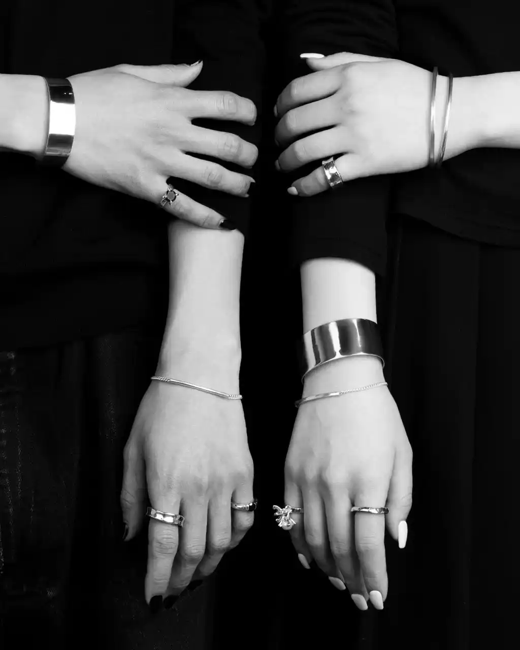 左人物着用 上から バングル(シルバー925)¥64,900、ブレスレット(シルバー925)¥28,600、右人物着用 上から 丸線バングル(シルバー925)¥35,200、角線バングル(シルバー925)¥37,400、バングル(シルバー925)¥102,300、ブレスレット(シルバー925)¥28,600 すべて税込 |