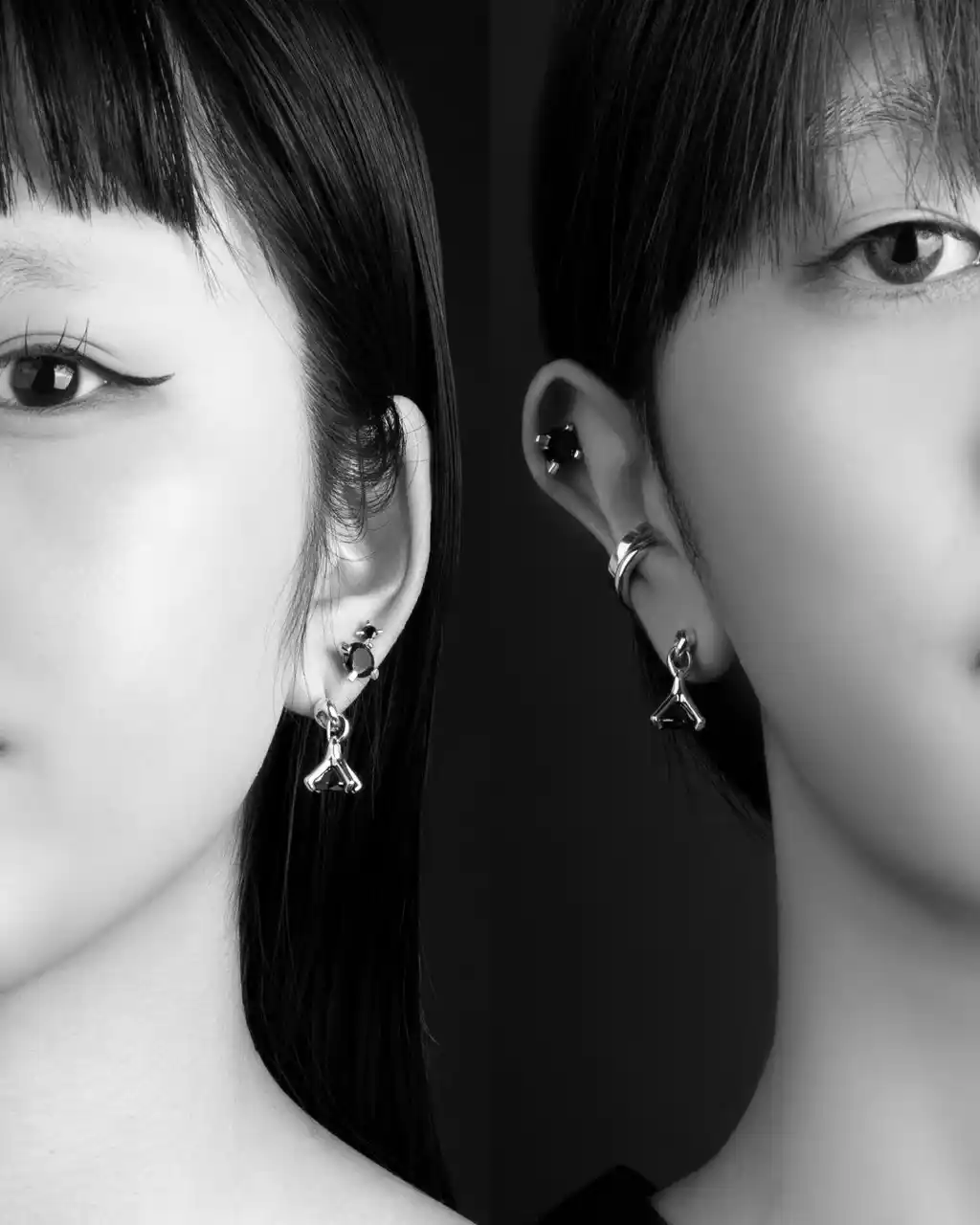 左人物着用 上から ピアス※シングル(シルバー925、キュービックジルコニア)¥9,900、ピアス※シングル(シルバー925、キュービックジルコニア)¥13,200、ピアス※シングル(シルバー925、キュービックジルコニア)¥23,100 右人物着用 イヤーカフ¥16,500、ピアス※シングル(シルバー925、キュービックジルコニア)¥12,100 すべて税込 |
