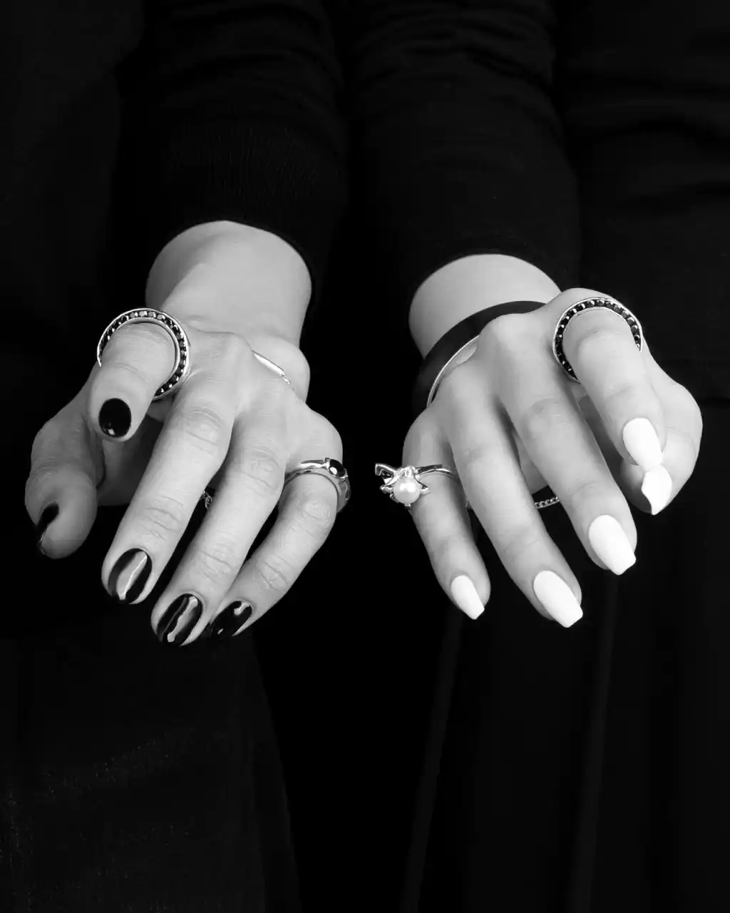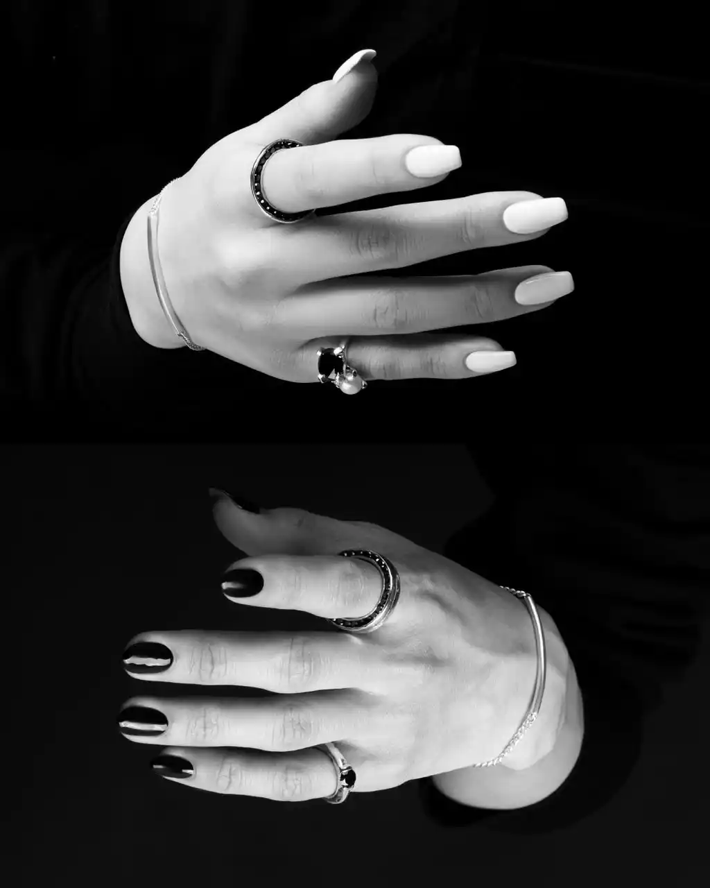 いぶし加工を施したシルバーとブラックカラーストーンの相性抜群の組み合わせはもちろん、パールと合わせることでモダンでエレガントな雰囲気を纏ったデザインも。 |