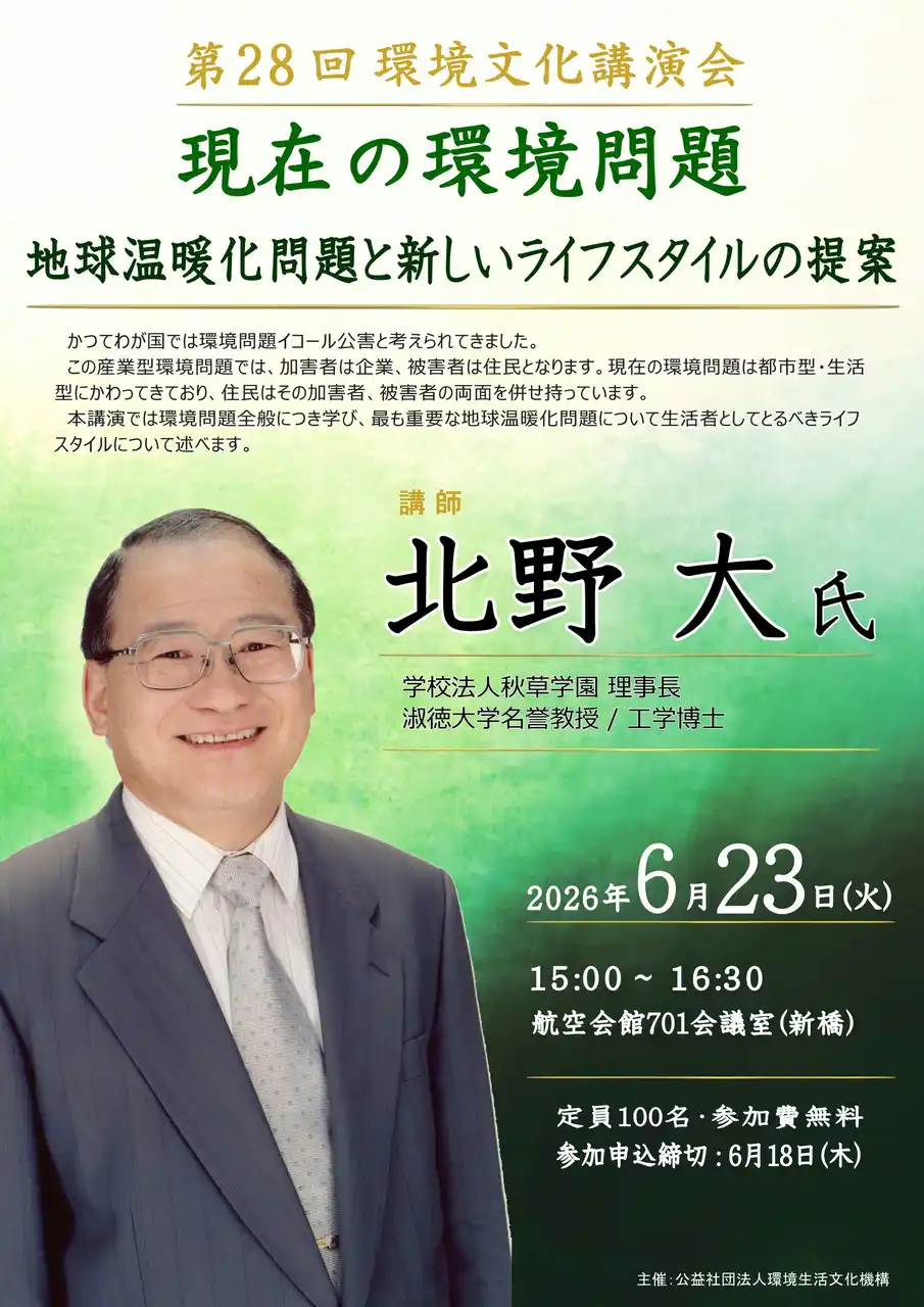 今年は、工学博士でありタレント ビート・たけし氏の兄としても知られる学校法人秋草学園 理事長 北野 大氏を講師にお招きし現在の環境問題についてお話いただきます。 |