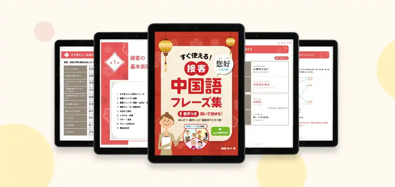 | 『すぐ使える!接客中国語フレーズ集』は、注文確認、案内、会計、声かけなど、接客の現場で必要になりやすい中国語表現を、シーン別・カテゴリ別に整理して収録しています。 | ||||||||||||||||||||||||||||||||||