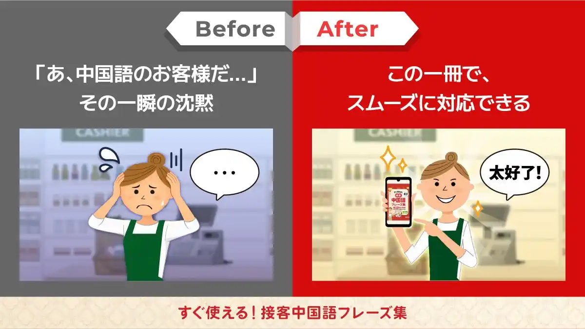 | 中国語対応の現場では、決まり文句をそのまま伝えるだけでなく、相手の状況や会話の流れに応じて自然に応答できるかどうかが、サービス品質の差につながる場面があります。本書は、そうした実際のやり取りを想定し、接客に必要な表現と会話を自然につなぐ表現の両方をまとめています。 | ||||||||||||||||||||||||||||||||||