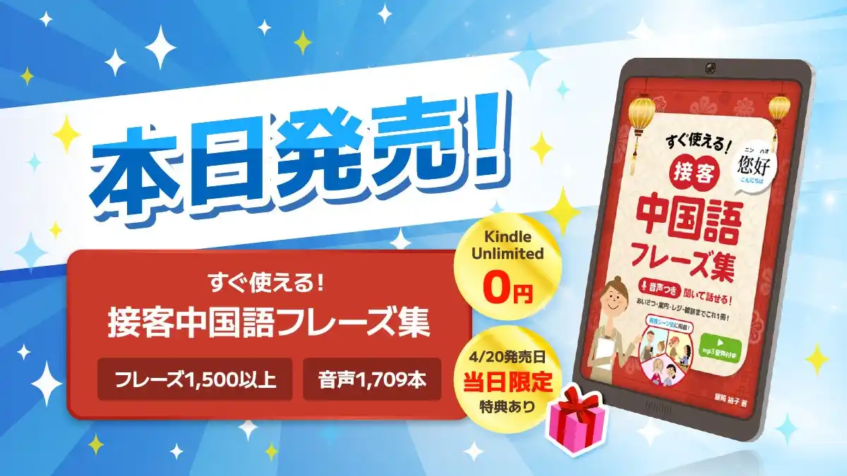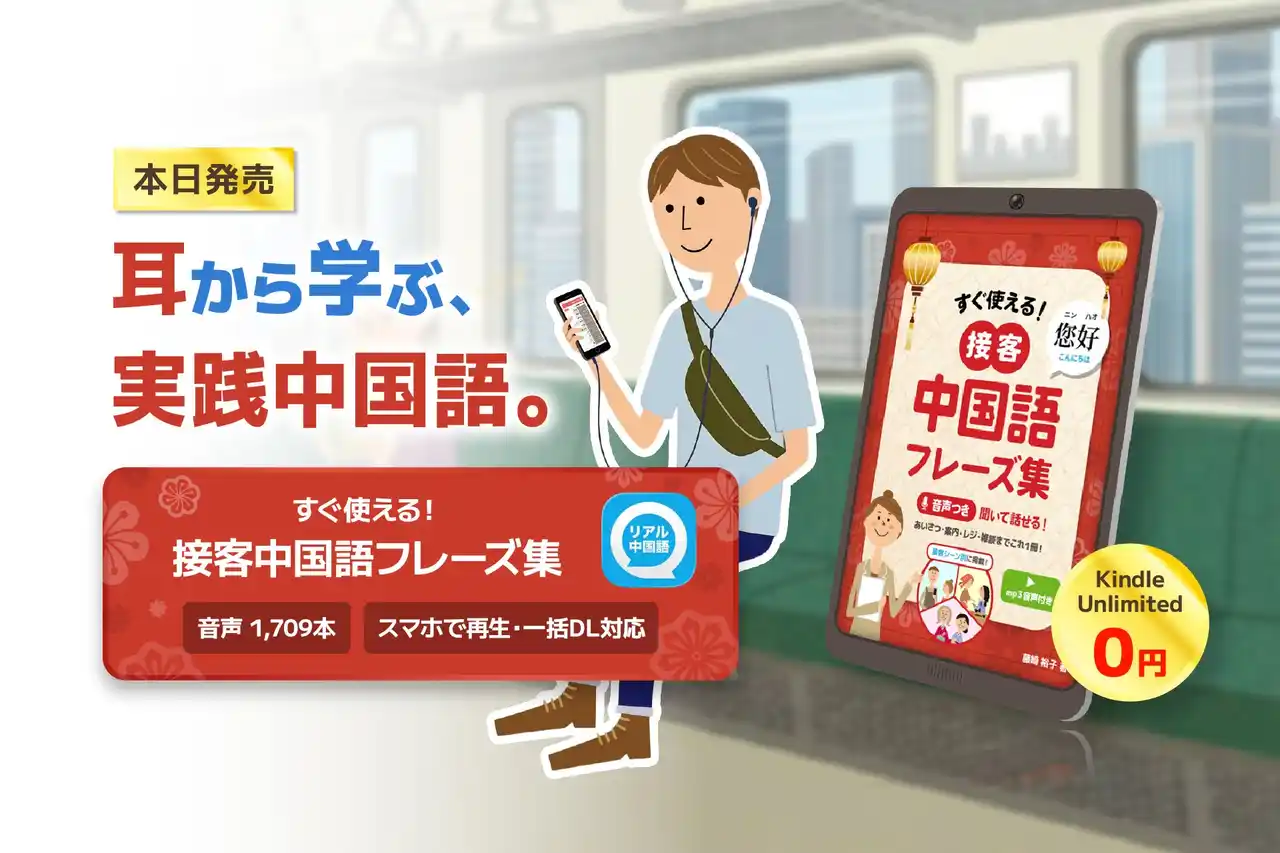 | 接客・旅行・日常で使える中国語1500フレーズ。ウェブ再生・DL対応音声でスキマ学習に最適。Kindle Unlimited会員0円。【4/20まで限定】音声付特典PDFプレゼント中。 |