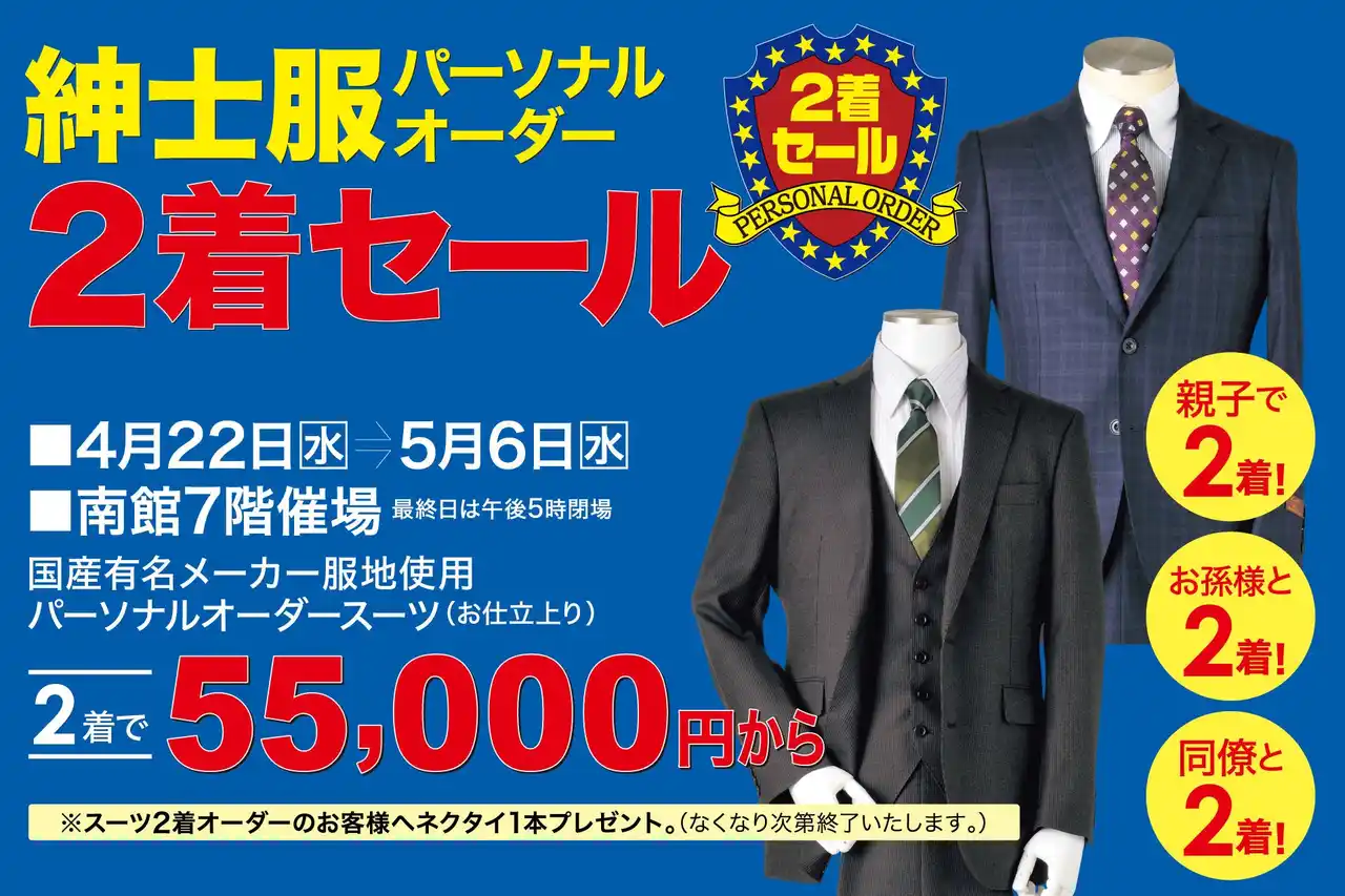 佐賀玉屋(本社:佐賀県佐賀市中の小路2-5、代表取締役社長 山越 悠登)は2026年4月22日(水)から5月6日(水)まで「紳士服パーソナルオーダー2着セール」を南館7階催場にて開催いたします。 |