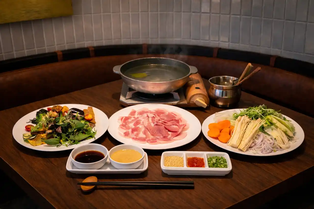 約30種類の食材を、メインのしゃぶしゃぶとともにセミビュッフェ形式で提供します。旭川出身のシェフが、富良野市・中富良野町・美瑛町を中心に野菜・フルーツ・米や味噌まで厳選。館内キッチンスタッフが市営農場を活用して育てた野菜も取り入れるなど、鮮度・安全性ともにこだわった一皿をお楽しみいただけます。サラダのほか、蕪のステーキ、ズッキーニのカルパッチョ、ナスのグリル、アスパラのフリッタータ、春菊を使ったバスクチーズケーキなど、野菜の可能性を引き出す多彩なメニューを揃えています。 |