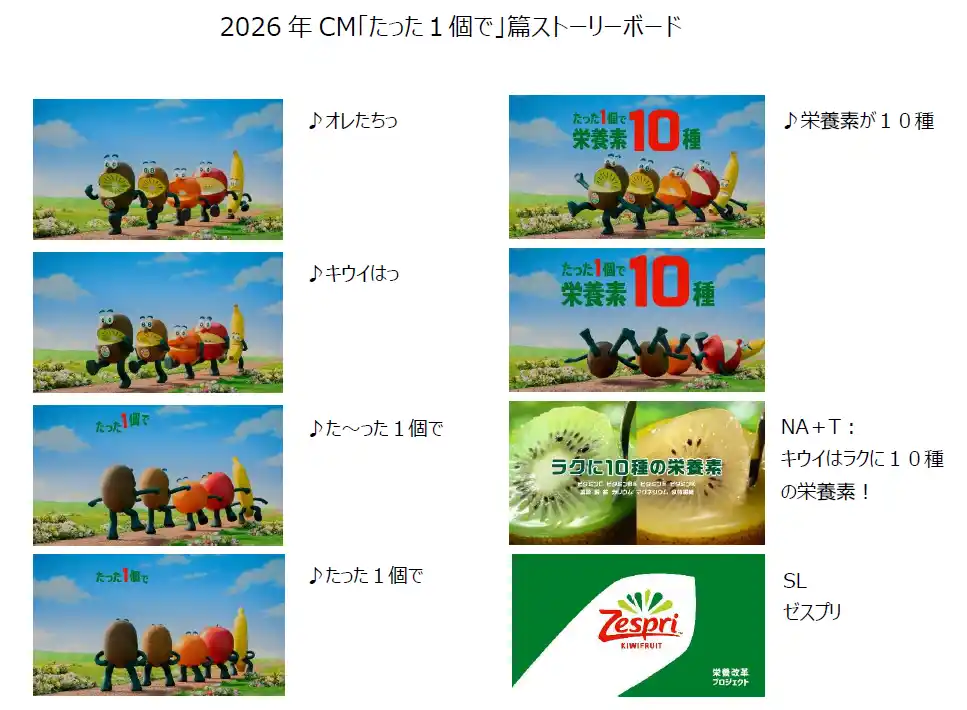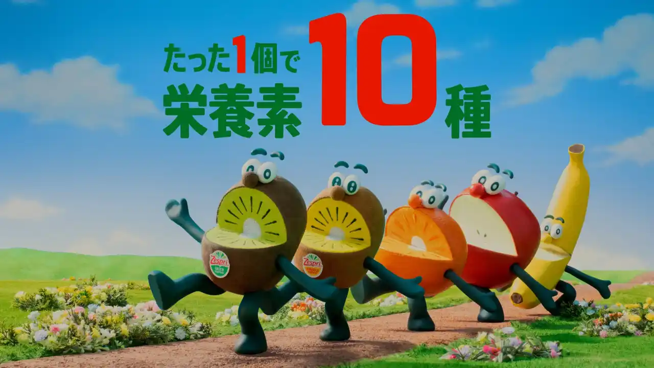 | 国民的人気を集めるゼスプリの「キウイブラザーズ」シリーズ。今年は、耳に残るキャッチーでコミカルな楽曲と印象的なキャラクター表現で、「キウイはたった1個で10種の栄養素が摂れる」というシンプルで力強いメッセージを展開します。歌って覚えられるコミュニケーションを通じて、幅広い世代に栄養価の高さを楽しく伝えます。 | |||