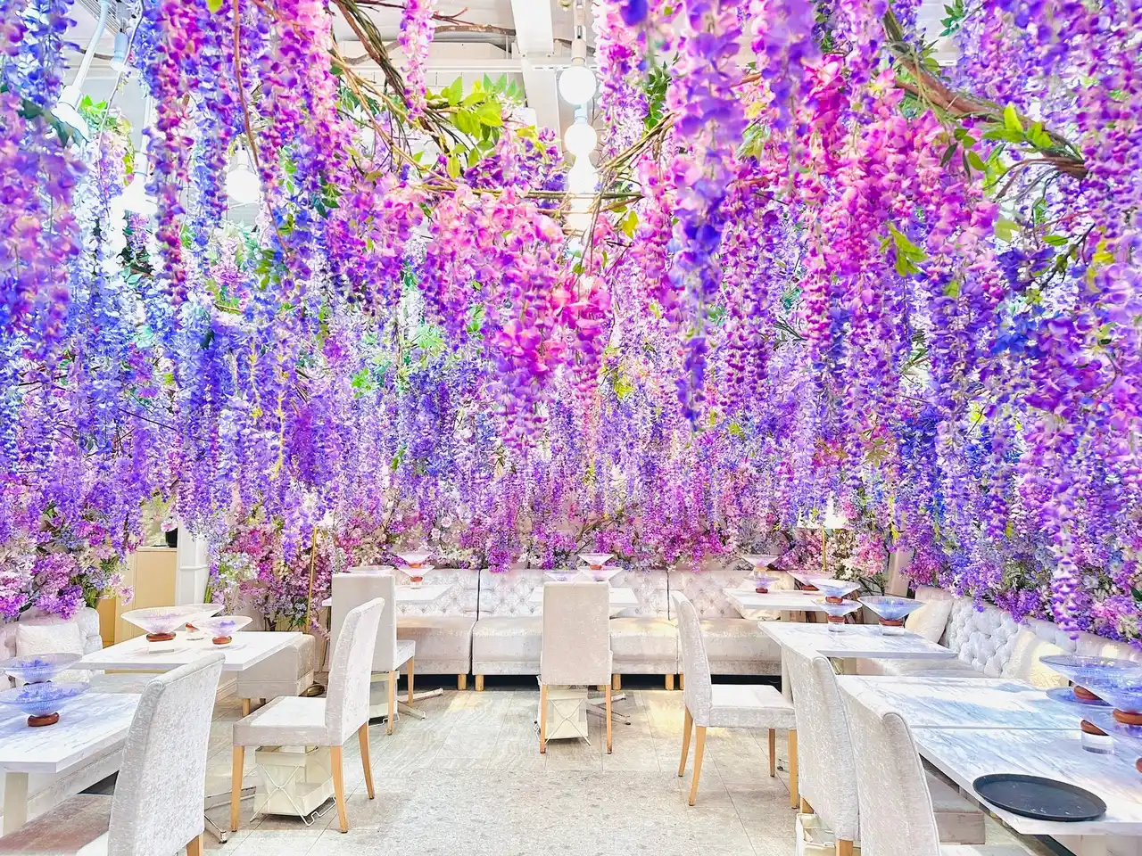 入口の扉を開けた瞬間、目の前に広がるディープパープルとペールライラックの藤色グラデーションに染まる店内は、甘く優美な妖精の庭園に迷い込んだかのような非日常空間です。頭上から空間全体を覆い尽くすダイナミックな藤棚と、壁一面からこぼれ落ちる藤の花のアーチが、圧倒的な没入感を演出します。大きな窓から自然光がたっぷりと差し込むと、花々は柔らかく透明感のある輝きを放ち、昼間ならではの幻想的な表情に。テーブルには藤色に美しく映える洗練されたシルバーやガラスウェアが並び、五感で味わう優雅なティータイムをより一層引き立てます。 |