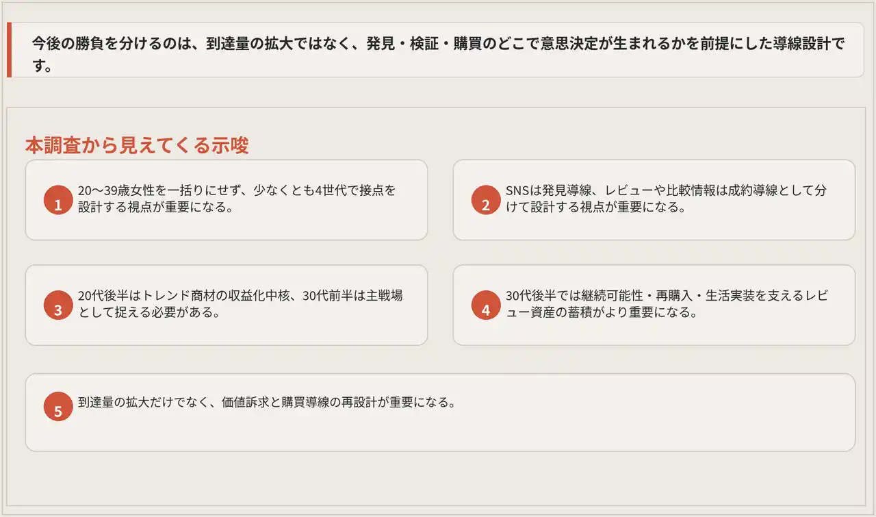 20~30代女性市場の違いは、価値観の断絶ではなく購買導線のグラデーションとして表れていた。 |