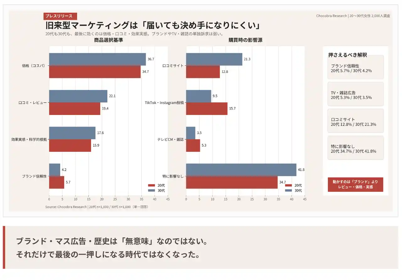 20代でも30代でも、美容商品を選ぶ際に重視されるのは、価格(コスパ)、口コミ・レビュー、効果実感・科学的根拠でした。逆に、ブランドの信頼性・歴史やテレビCM・雑誌広告は、単独では購入の決め手になりにくくなっています。 |