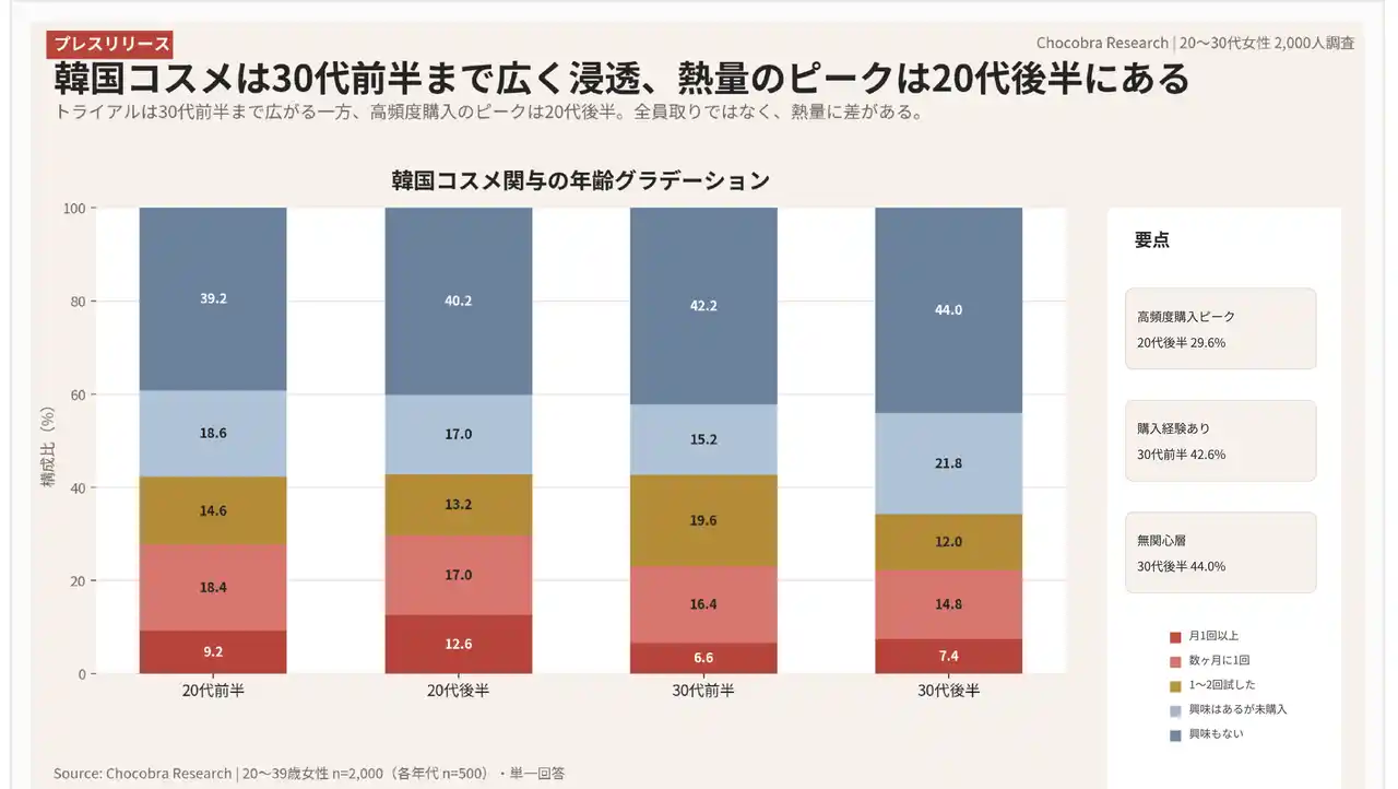 Chocobra Researchは、20代女性1,000人、30代女性1,000人、計2,000人を対象に、美容商品の購買チャネル、情報源、選択基準、韓国コスメ購入経験、購買時の影響源に関する調査を実施しました。 その結果、20代と30代の違いは、一般に語られがちな「価値観の断絶」ではなく、どこで見つけ、誰を経由して信じ、どこで買うかという購買導線のグラデーションとして現れていることが明らかになりました。 |