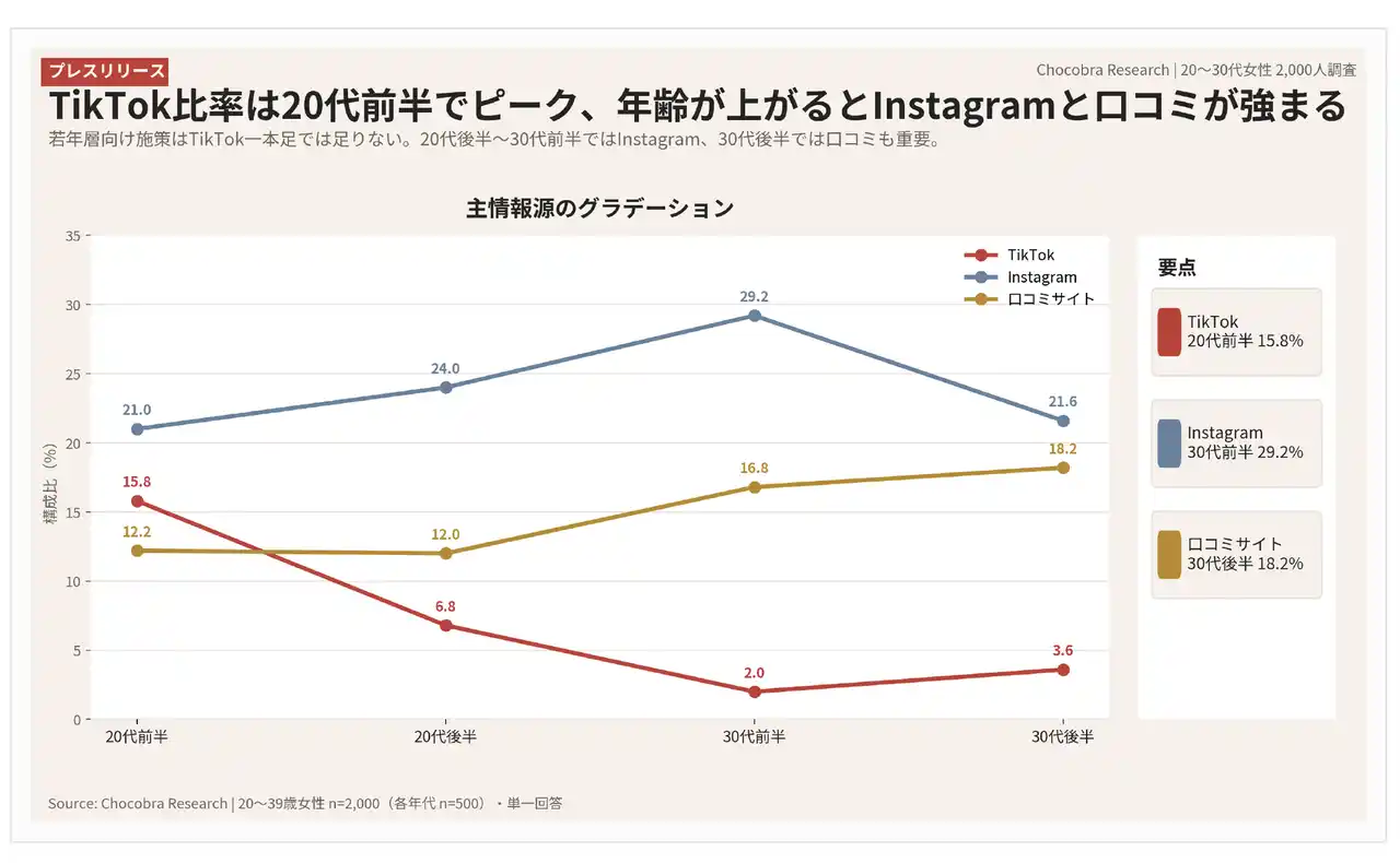 TikTokは20代前半で最も強い入口でしたが、年齢が上がるにつれて中心プラットフォームはInstagramへ移ります。さらに30代後半では、主情報源として口コミサイトの比重が高まり、情報接触の質そのものが変化していきます。 |