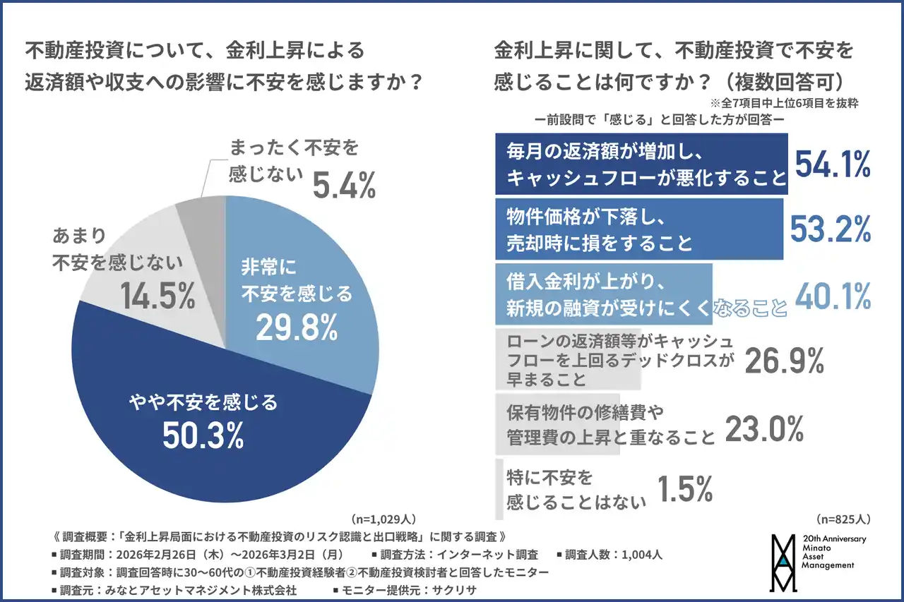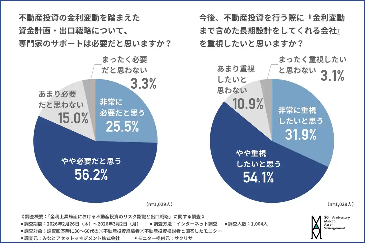 みなとアセットマネジメント株式会社(所在地:東京都港区、代表取締役:向井 啓和)は、30~60代の1.不動産投資経験者2.不動産投資検討者を対象に「金利上昇局面における不動産投資のリスク認識と出口戦略」に関する調査を行いました。