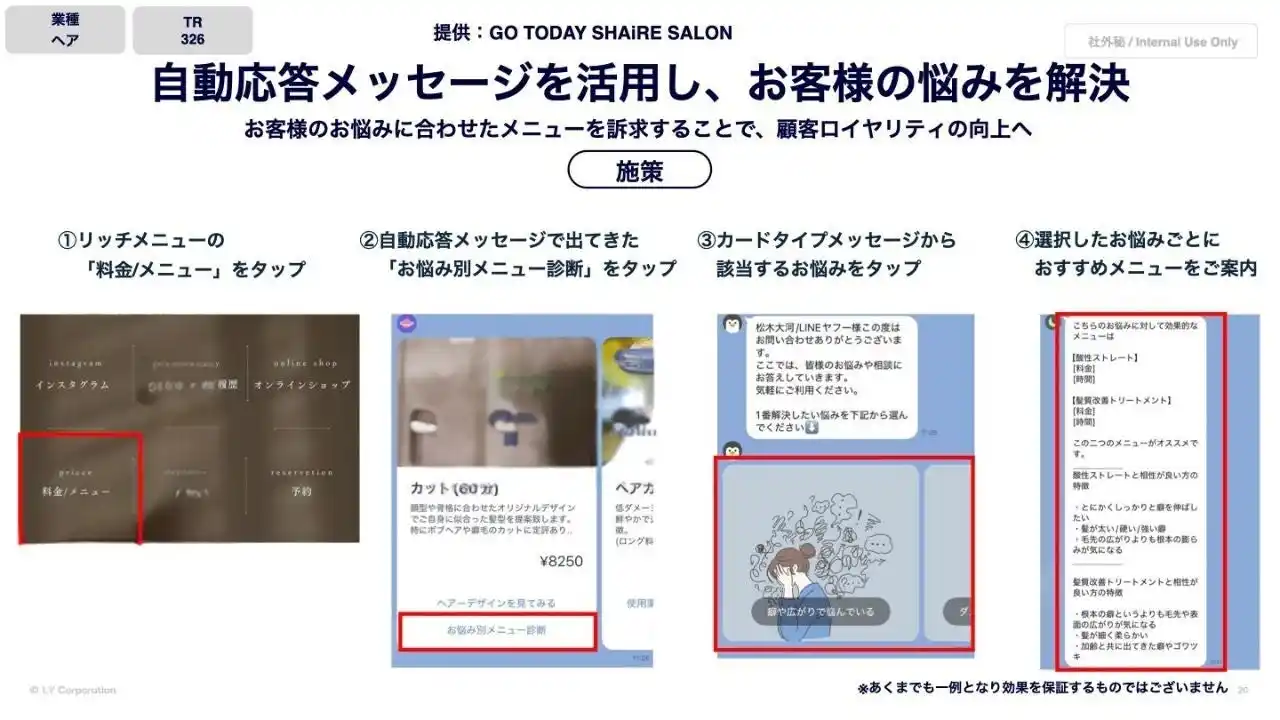 また、今回のセミナーの最大の見どころとなったのが、後半パートの実例紹介です。 前段では美容業界大手のLINE公式アカウント活用事例が紹介され、業界全体のトレンドが共有されました。 そこから「では、フリーランスではどうしたらいいのか?」に焦点を絞り、GO TODAY SHAiRE SALONで実際に活躍するクルーの実例紹介へ。この流れこそが、今回のセミナーでしか体験できない価値でした。 |