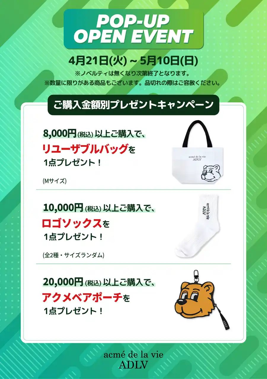 本POP-UPでは、ADLVを象徴するベア(クマ)グラフィックのTシャツ、キャップ、バッグをはじめ、シーズン新作やコラボレーションアイテムを幅広くラインナップ。さらに、ご来店のお客様限定のSNSフォロー&投稿キャンペーンや、ご購入金額に応じたオリジナルノベルティプレゼントなど、ADLVの世界観をたっぷりと体験いただける多彩なキャンペーンを実施いたします。 |