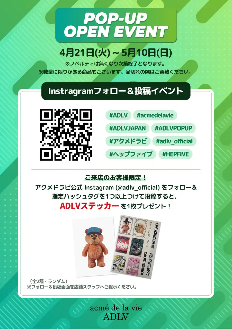 ご来店のお客様限定で、ADLV公式Instagram(@adlv_official)をフォローのうえ、指定ハッシュタグのいずれかを1つ以上付けてSNSに投稿いただいた方に、ADLVオリジナルステッカー(全2種・ランダム)を1枚プレゼントいたします。 |