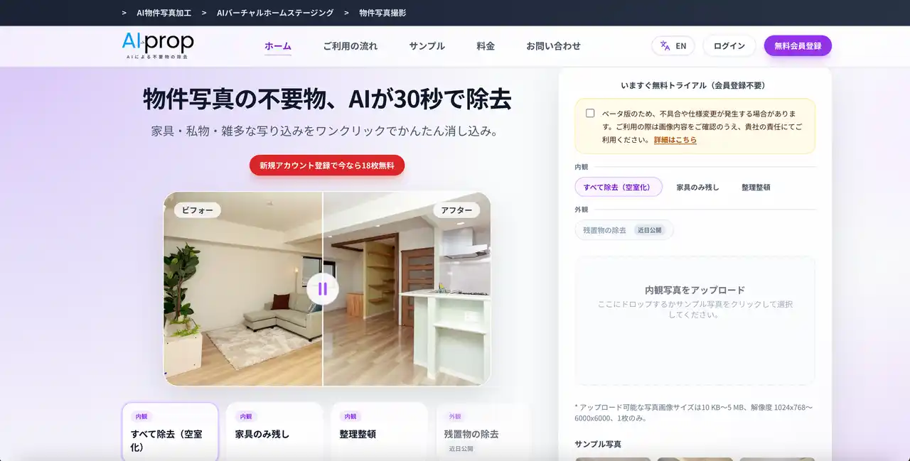 | A-LEADS HOLDINGS PTE.LTD(本社:10 Anson Road #31-10 International Plaza, Singapore/営業拠点:A-LEADS Japan株式会社/開発拠点:A-LEADS IT Cambodia Co.,Ltd./代表取締役:橋本元秀、以下エイリーズ)は、不動産業界向けAI物件写真加工サービス「AI-prop(AIプロップ)」において、新たにAIによる不要物の除去サービスサイトをリリースいたしました。除去レベルも3段階用意し、1.すべて除去(完全な空室状態)2.家具のみ残す(生活感のみ削除)3.整理整頓(自然に整えた状態)をお選びいただけます。*AIによる物件写真加工は特許出願中 | |||