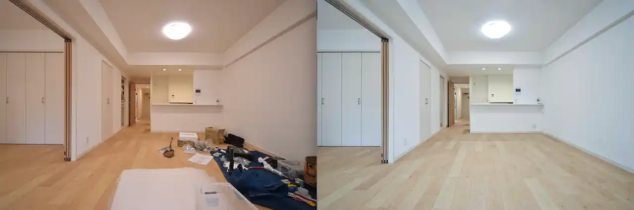 | そのため単なる不要物の削除ではなく、不動産広告として違和感のない空間補正や、掲載時に見やすい構図バランスの最適化、そして居住・空室・整理整頓など用途別の最適化といった「広告として成立する写真品質」を前提に設計されています。 | |||