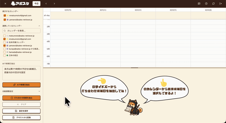 Google/Outlookカレンダーと連携し、複数人での空き状況を自動抽出 |